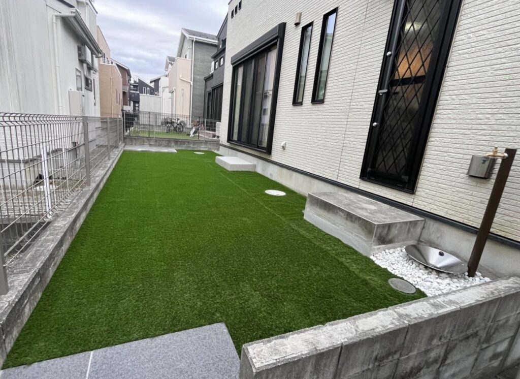 お子様の成長に合わせ人工芝にしスポーツを楽しめるお庭にしたいとのご依頼でした。既存ウッドデッキ・タイルデッキを解体し、人工芝を施工。一面緑の広々とした空間に生まれ変わりました。