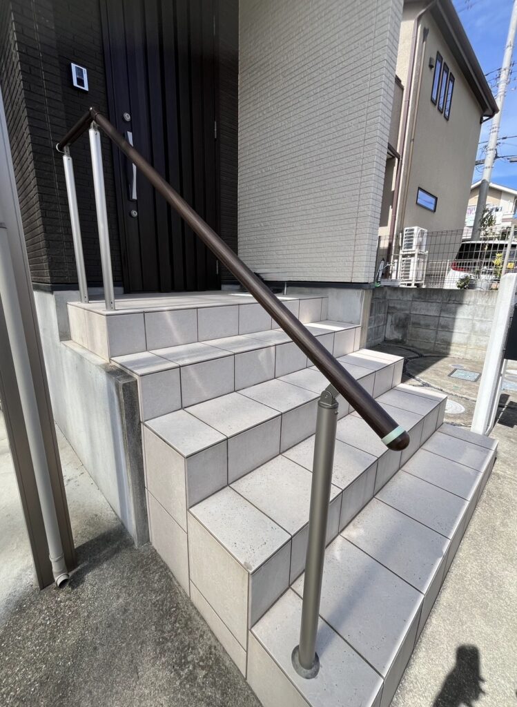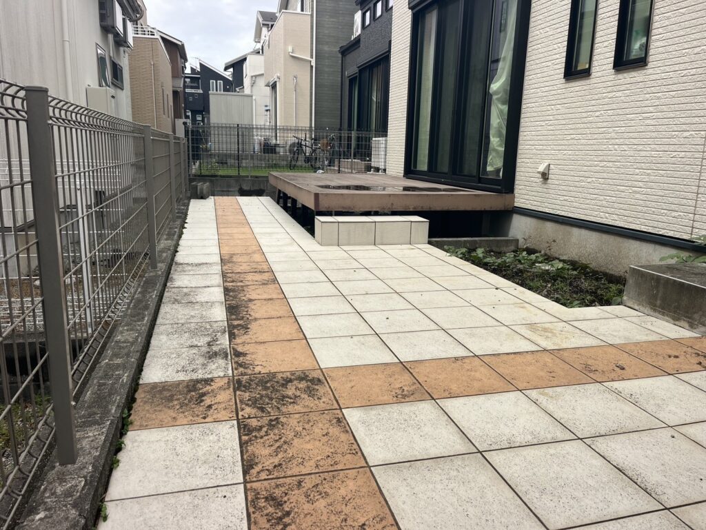 リフォーム工事、既存ウッドデッキ・タイルデッキ解体、人工芝施工、物置基礎、タイルステップ、立水栓交換、防草シート施工(砂利敷)、手すり工事