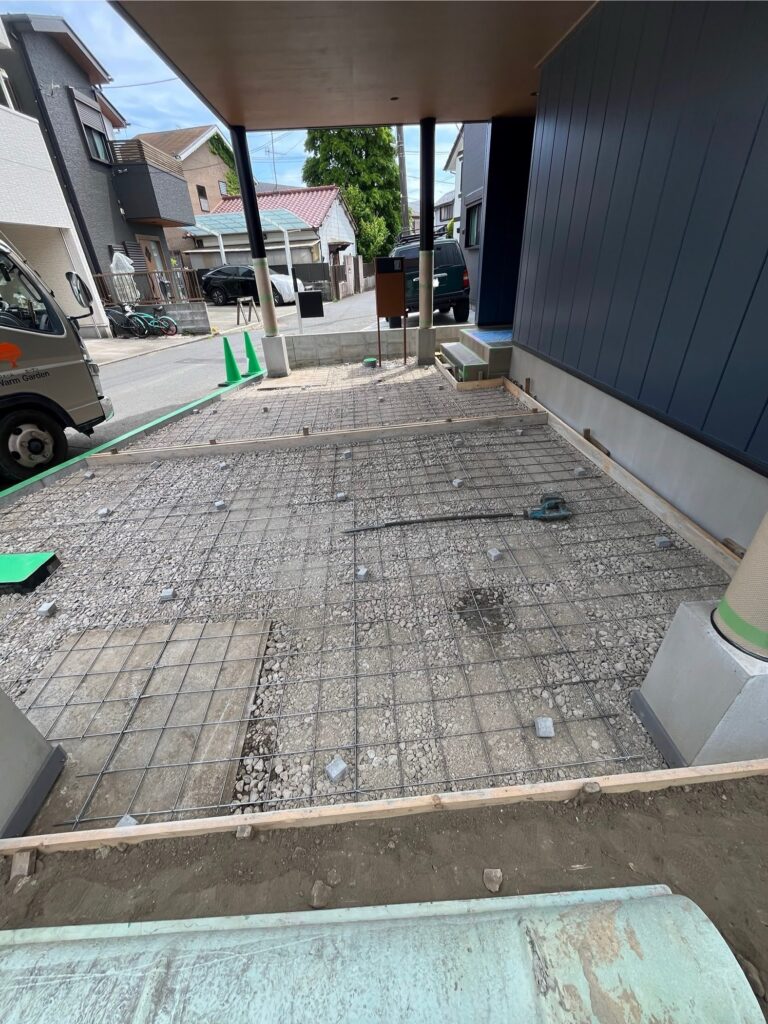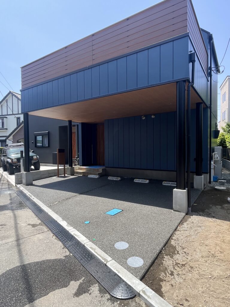 コンクリート洗い出し仕上げはすべり止めとしても良いですが何より濡れた時の表情がとても際立つワンランク上の土間コンクリート。湘南の雰囲気にピッタリな青いオシャレな外観のお宅にピッタリマッチした高級感のある素敵なお庭に仕上がりました。